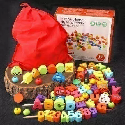 Шнурівка дерев`яна C 74419 (40) 6 шнурків з дерев’яним краєм, абетка, цифри, математичні знаки, транспорт, в коробці