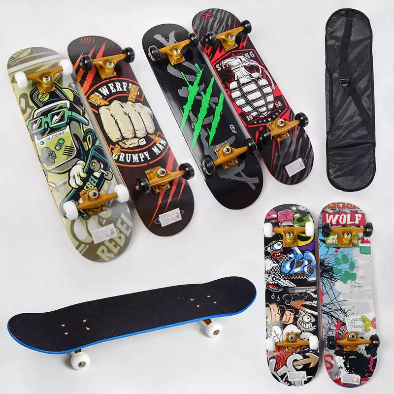 Скейт деревянный S 00675 (6) 6 видов, колеса PU, диаметр 5.5 cм, подшипники ABEC-7, подвеска – алюминий, амортизатор PU, в сумке