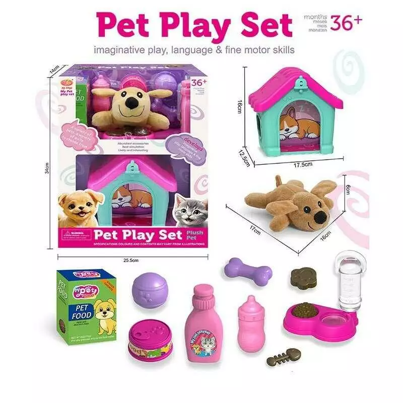 Собачка з аксесуарами KJ 121 A-3 (24) плюшева тваринка, будочка висотою 16 см, мисочка з кормом, поїлка, кістка, пляшечка, консерва, м’ячик, в коробці