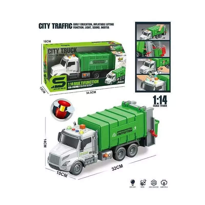 Спецтехніка JS 185 (36/2) "Сміттєвоз", світло, звук, інерція, рухомі елементи, помповий механічний підіймач, баки для сміття, 1:14, в коробці