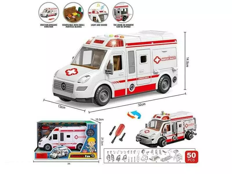 Спецтехніка YW 8088 C (24/2) "Швидка допомога", звуки, підсвічування, інерція, конструктор, викрутка, в коробці