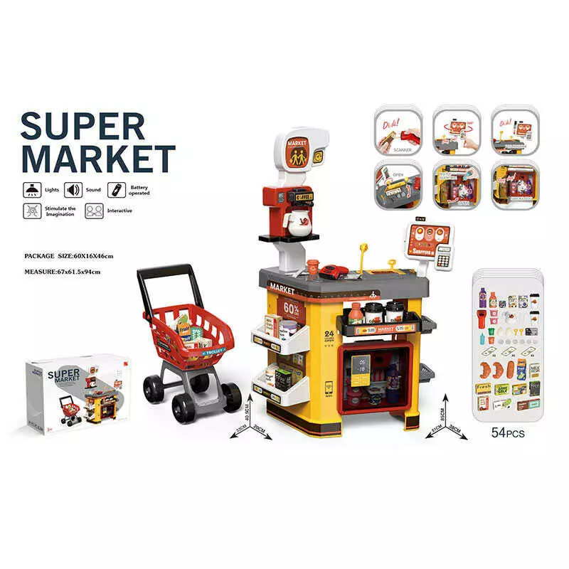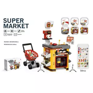 Супермаркет 668-130 (8) розмір - 51х38х85 см, 54 предмети, звуки, підсвічування, візочок, холодильник, сканер, каса, картка, купюри, харчі, в коробці