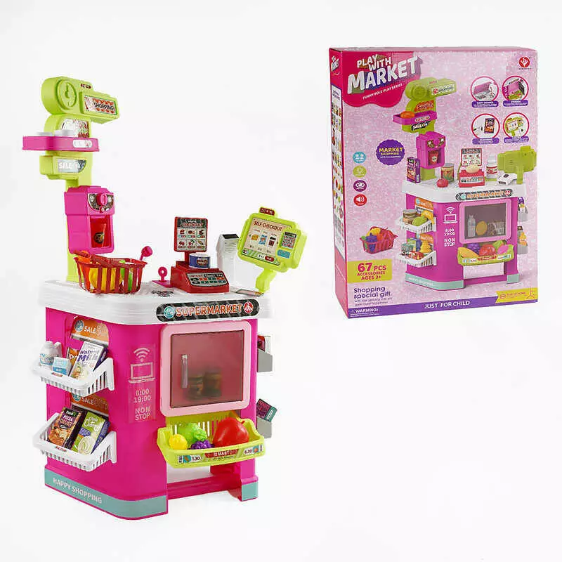 Супермаркет 922-199 (8) 67 елементів, звук, підсвічування, касовий апарат, сканер, ваги, купюри, монети, продукти, кошик, в коробці