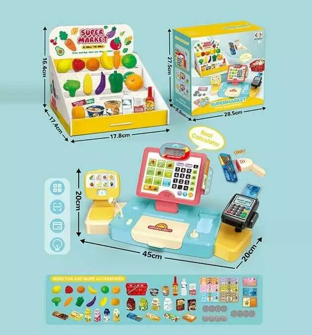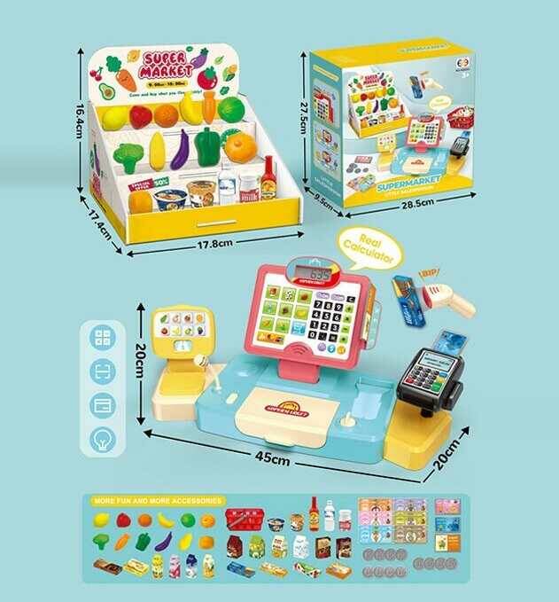 Супермаркет HS 6633 (12) розмір: 20х45х20 см, касовий апарат, калькулятор, сканер, звук, підсвічування, продукти, продуктовий кошик, гроші, в коробці
