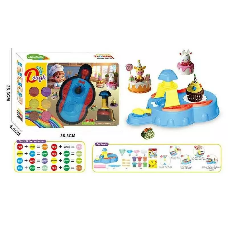 Тісто для ліплення 9028 (36/2) прес, довжина - 22 см, тісто у 6ти кольорах, тарілочка, форми, виделка, ложка, 2 ножі, в коробці