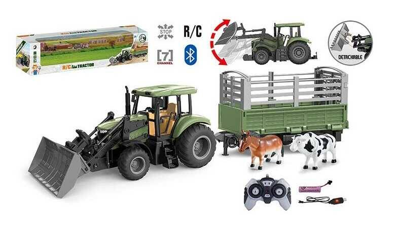Трактор на радіокеруванні 1908-3 AT (15) причіп, рухомі елементи, акум. 3.7V, пульт, додаток, Bluetooth, автоматичне підіймання ковша, в коробці