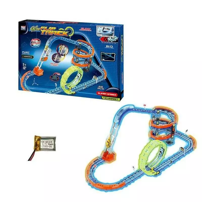 Трек 89987 (12) 69 елементів, машинка із вбудованим акумулятором, підсвічування, світиться у темряві, трюки, муляжі оточення, в коробці