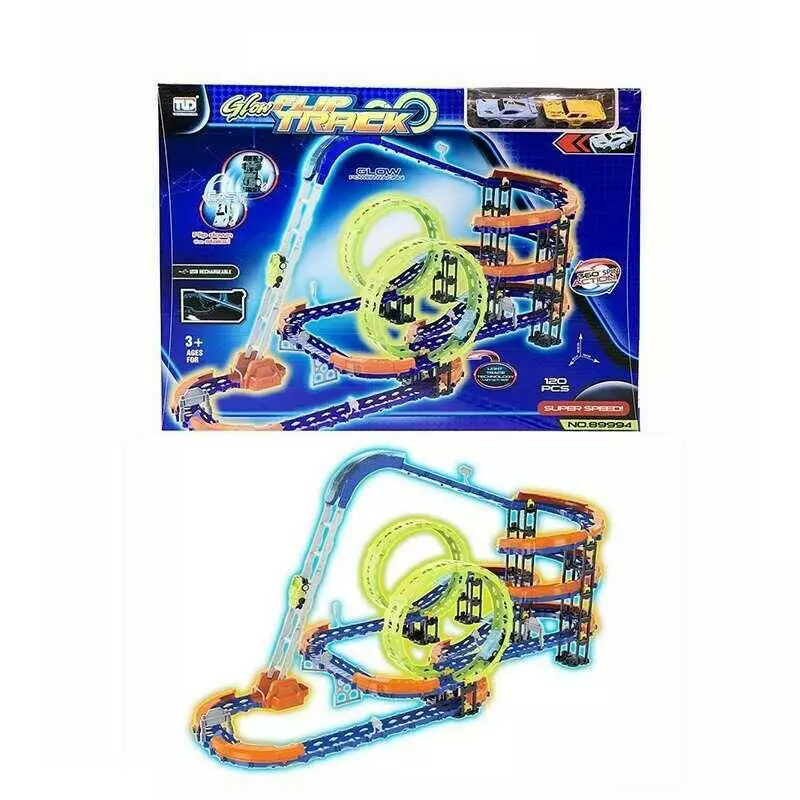 Трек 89994 (12) 122 елементи, 2 машинки із вбудованими акумуляторами, підсвічування, світиться у темряві, трюки, мі, трюки, муляжі оточення, в коробці