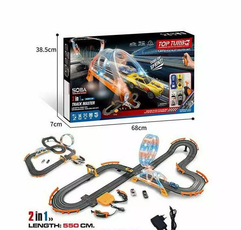 Трек A 65-3 A (8/2) підсвічування, механічне табло, міст, довжина треку 550 см, 2 машинки, 2 джойстики, від батарейок/мережі, масштаб 1:64, в коробці