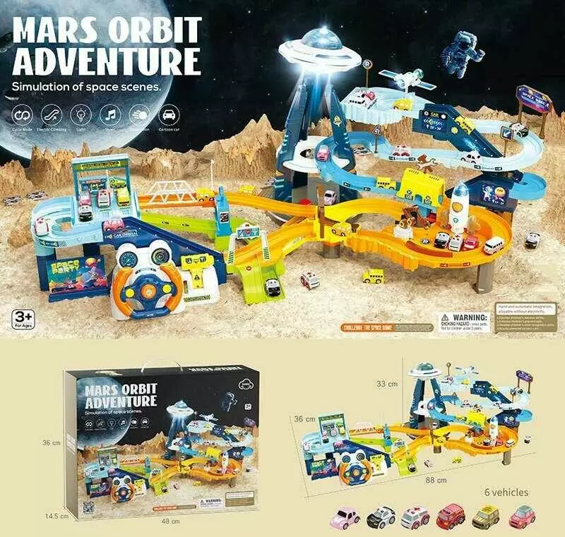 Трек T 918 A (8) “Космічна станція”, електричні підіймачі, світло, звуки, пісні англійською, 6 машинок, від батарейок, 2в1, в коробці
