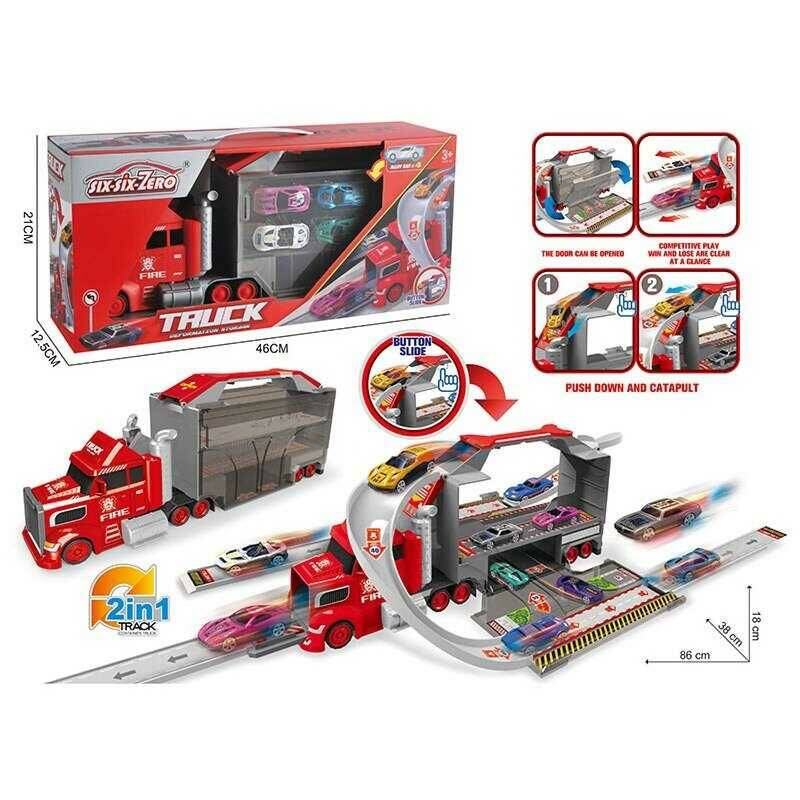 Трейлер 660 S-44 (24/2) трек, довжина треку: 86 см, механічний запускач, 4 металопластикові моделі, дорожні знаки, наліпки, в коробці
