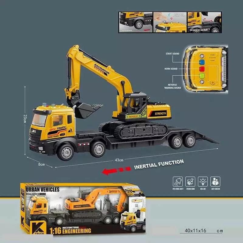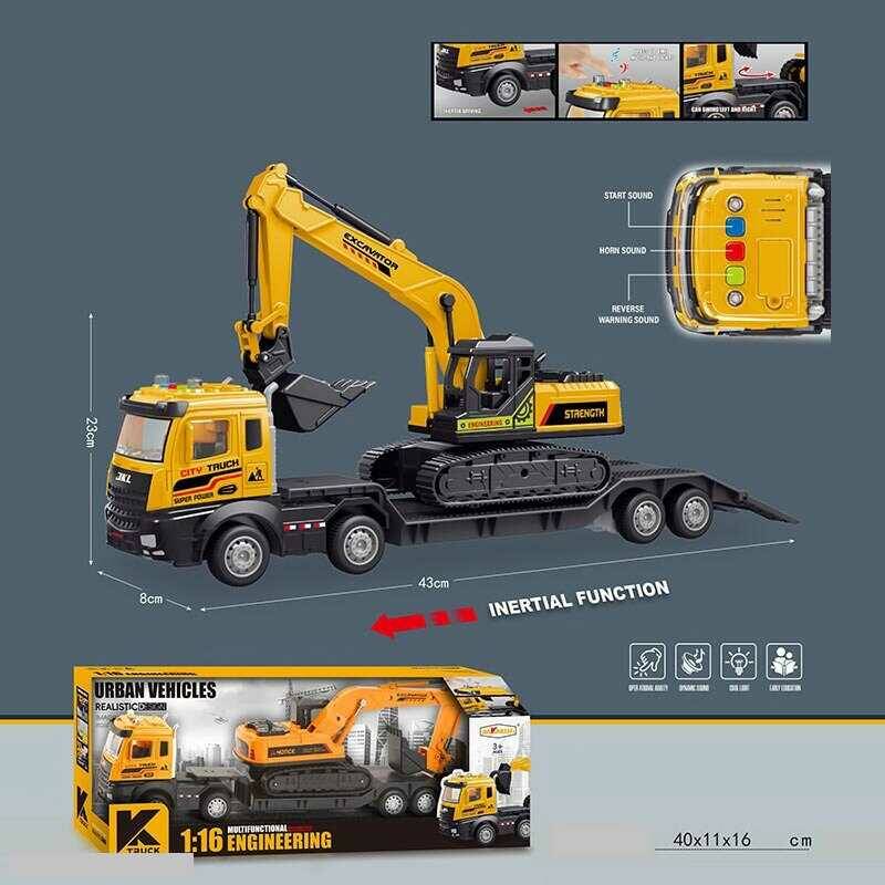 Трейлер JKL 186 A (48/2) “Спецтехніка”, масштаб: 1:16, підсвічування, звуки, інерційний механізм, з екскаватором, обертова платформа, ківш, в коробці