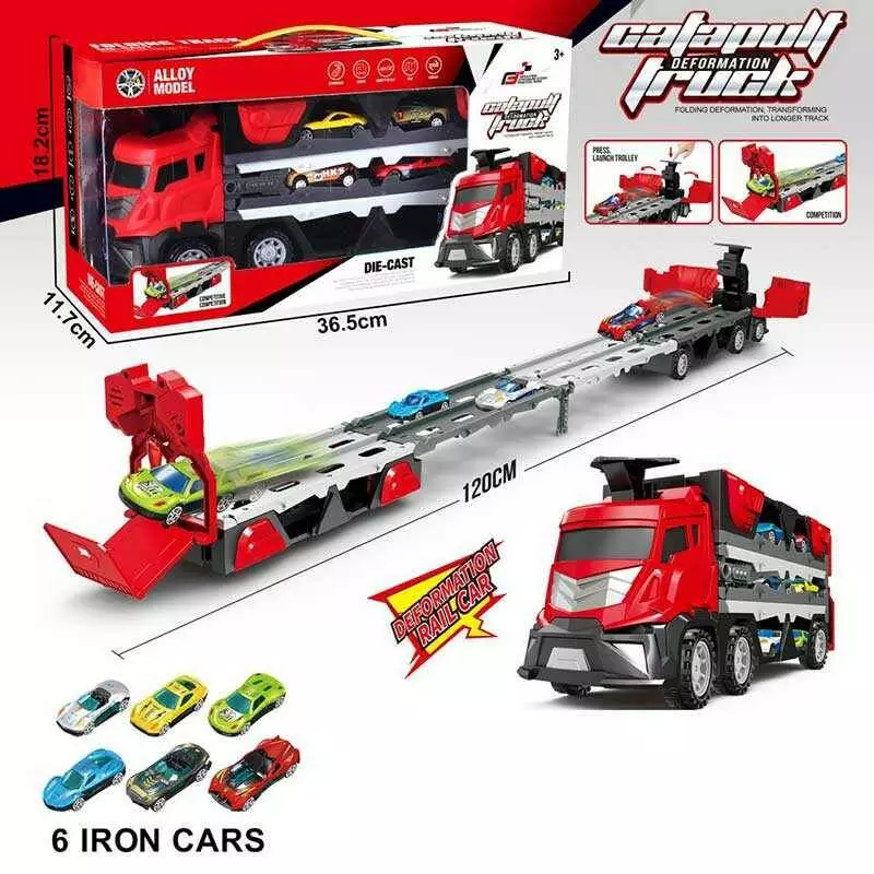 Трейлер-трек 825 (40) ЧЕРВОНИЙ, розмір - 32х10х14 см, довжина треку - 120 см, механічний запускач, 6 металопластикових моделей, в коробці, в коробці