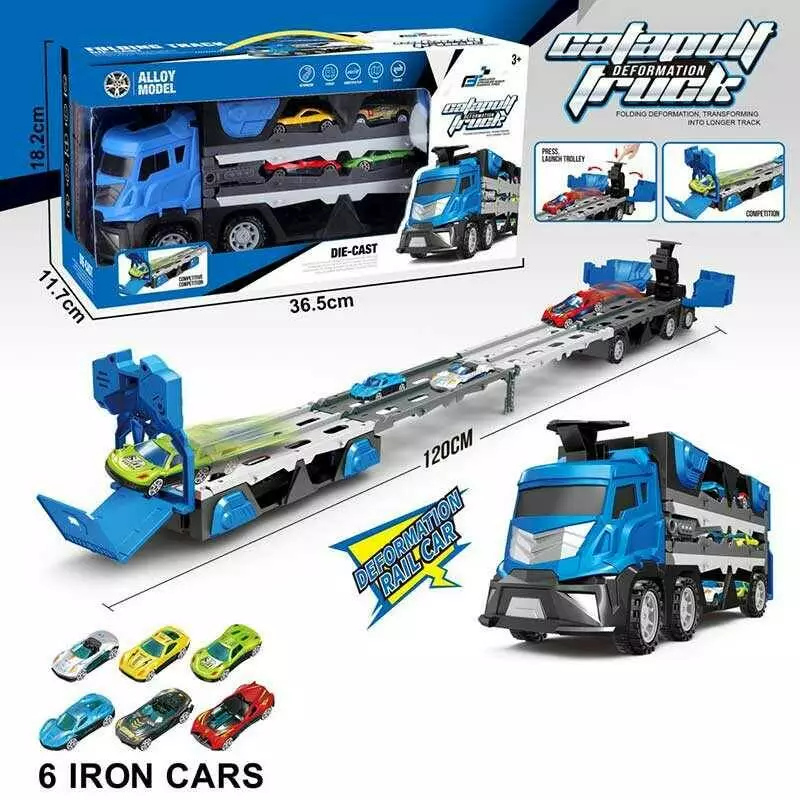 Трейлер-трек 829 (40) СИНІЙ, розмір - 32х10х14 см, довжина треку - 120 см, механічний запускач, 6 металопластикових моделей, в коробці