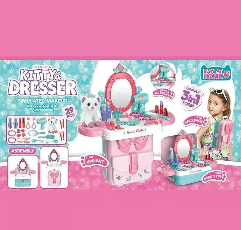 Трюмо 661-3003 (18) пластиковий рюкзачок, ремінці, муляж косметики, аксесуари, м’яка іграшка - котик, в коробці