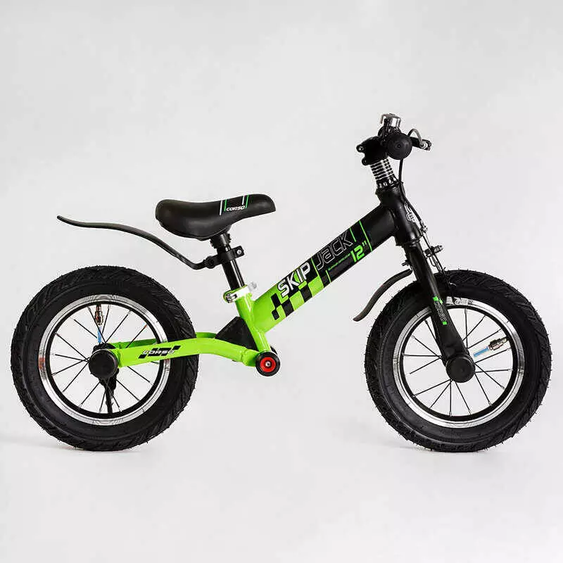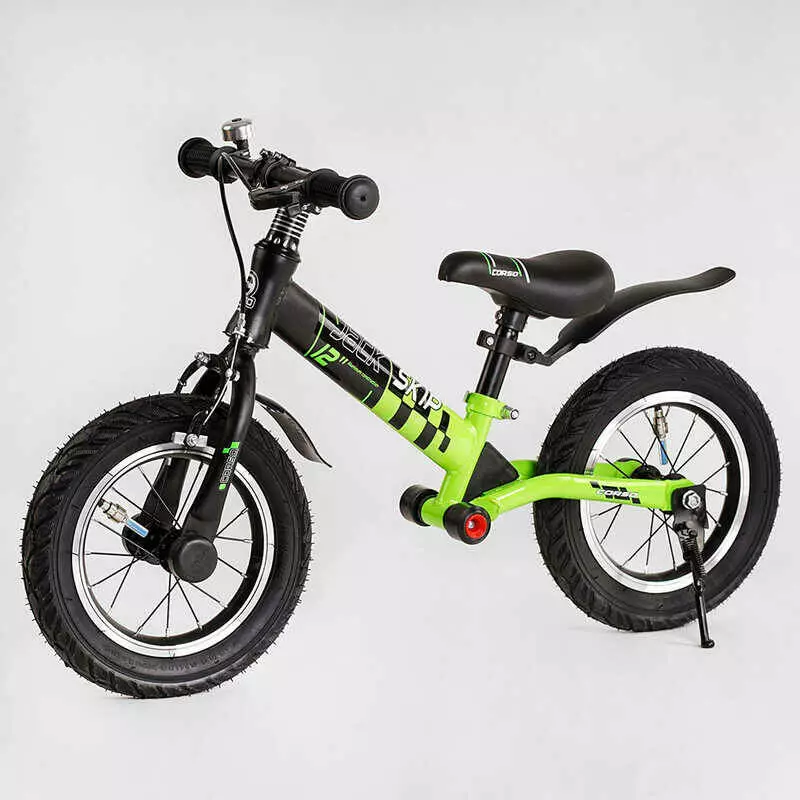 Велобег Corso "Skip Jack" 95112 (1) ЧЕРНО-ЗЕЛЕНЫЙ, надувные колеса 12", стальная рама с амортизатором, ручной тормоз, подножка, в коробке