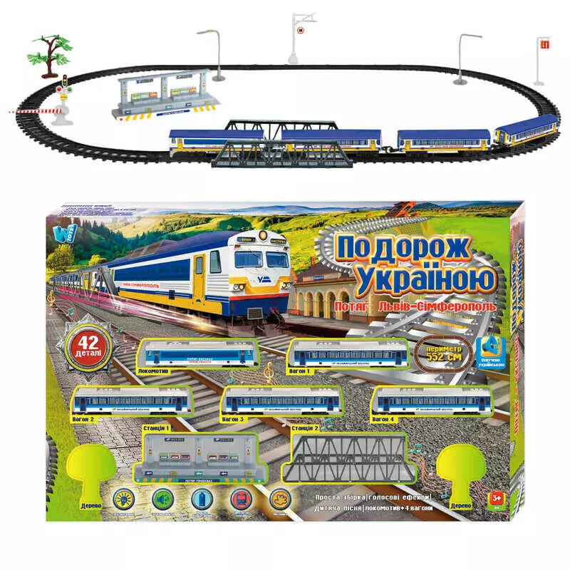 Залізниця 11500 (24) "WToys", ОЗВУЧУВАННЯ УКР. МОВОЮ, 42 деталі, звуки, пісня, озвучені репліки, локомотив, 4 вагони, муляжі оточення, в коробці