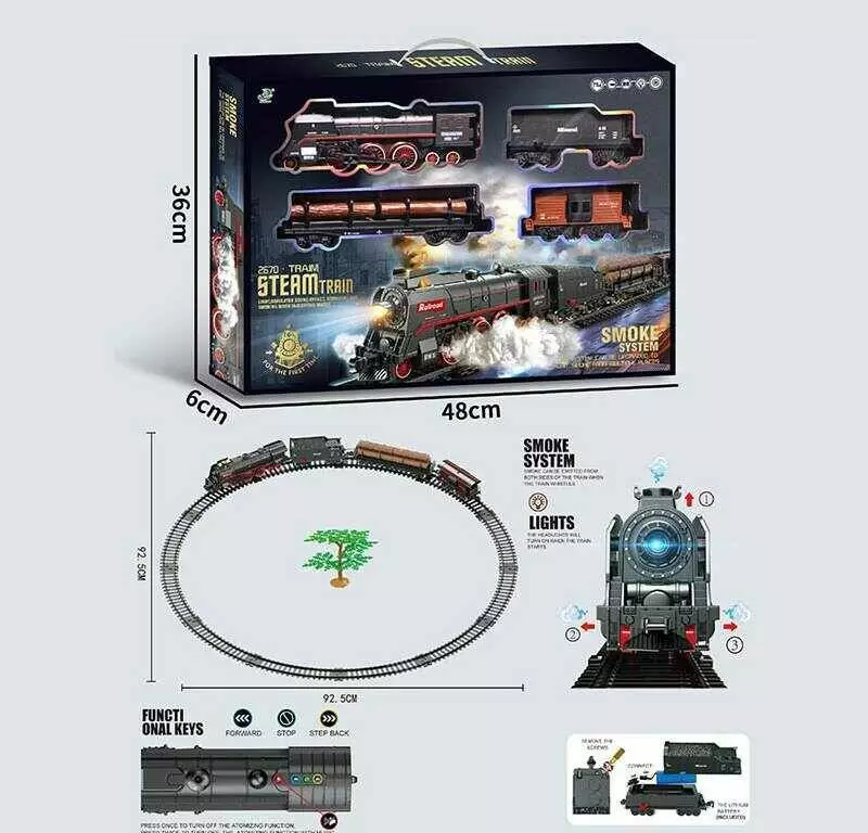 Залізниця 601 B (12) 4 вагони довжиною 72 см, дорога 92.5х92.5 см, світло, пара, звук-беззвуч. режим, рух вперед-назад, ак. 3.7V, в коробці