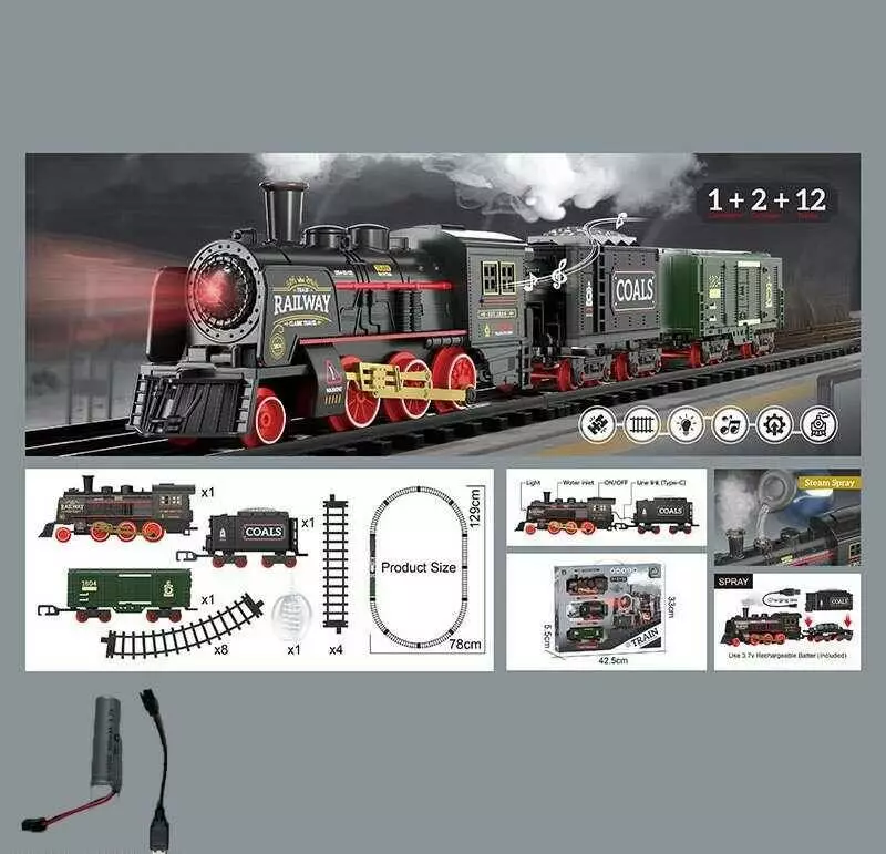 Залізниця 652 X12 (42/2) парогенерація, підсвічування, звук, акумулятор, дорога 78х129 см, 1 локомотив, 2 вагони, 12 елементів дороги, в коробці