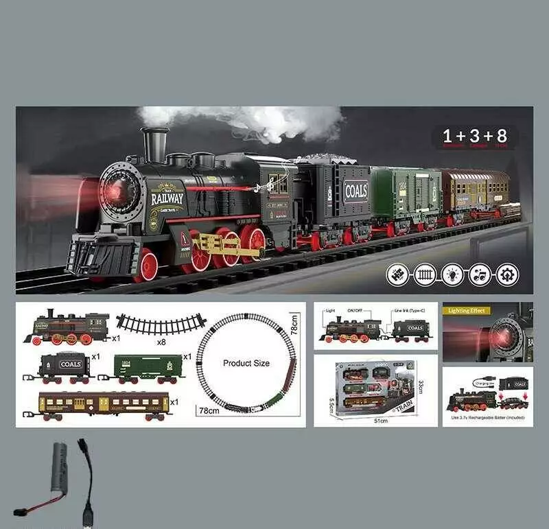 Залізниця 652 X18 (36/2) парогенерація, підсвічування, звук, акумулятор, дорога 78х78 см, 1 локомотив, 3 вагони, 8 елементів дороги, в коробці